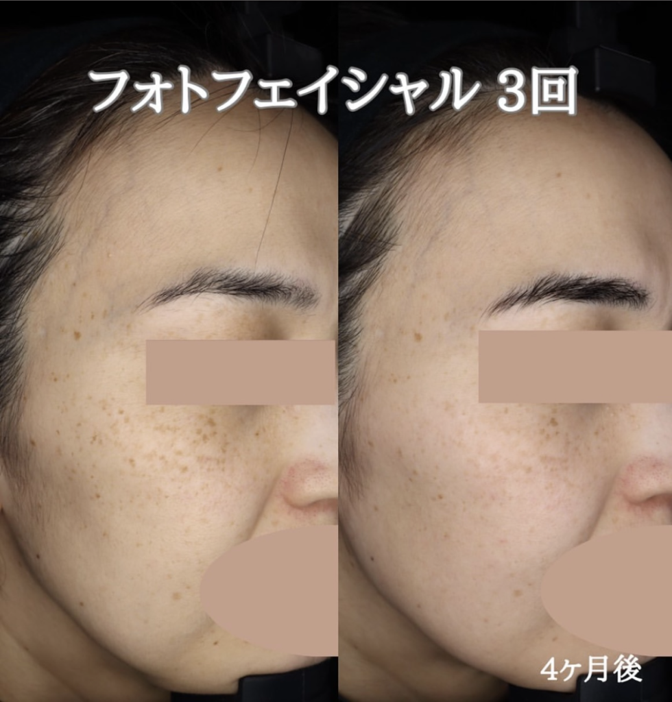 フォトフェイシャルを3回受けられた結果、シミが徐々に薄くなり、肌全体のトーンが明るく改善しています。